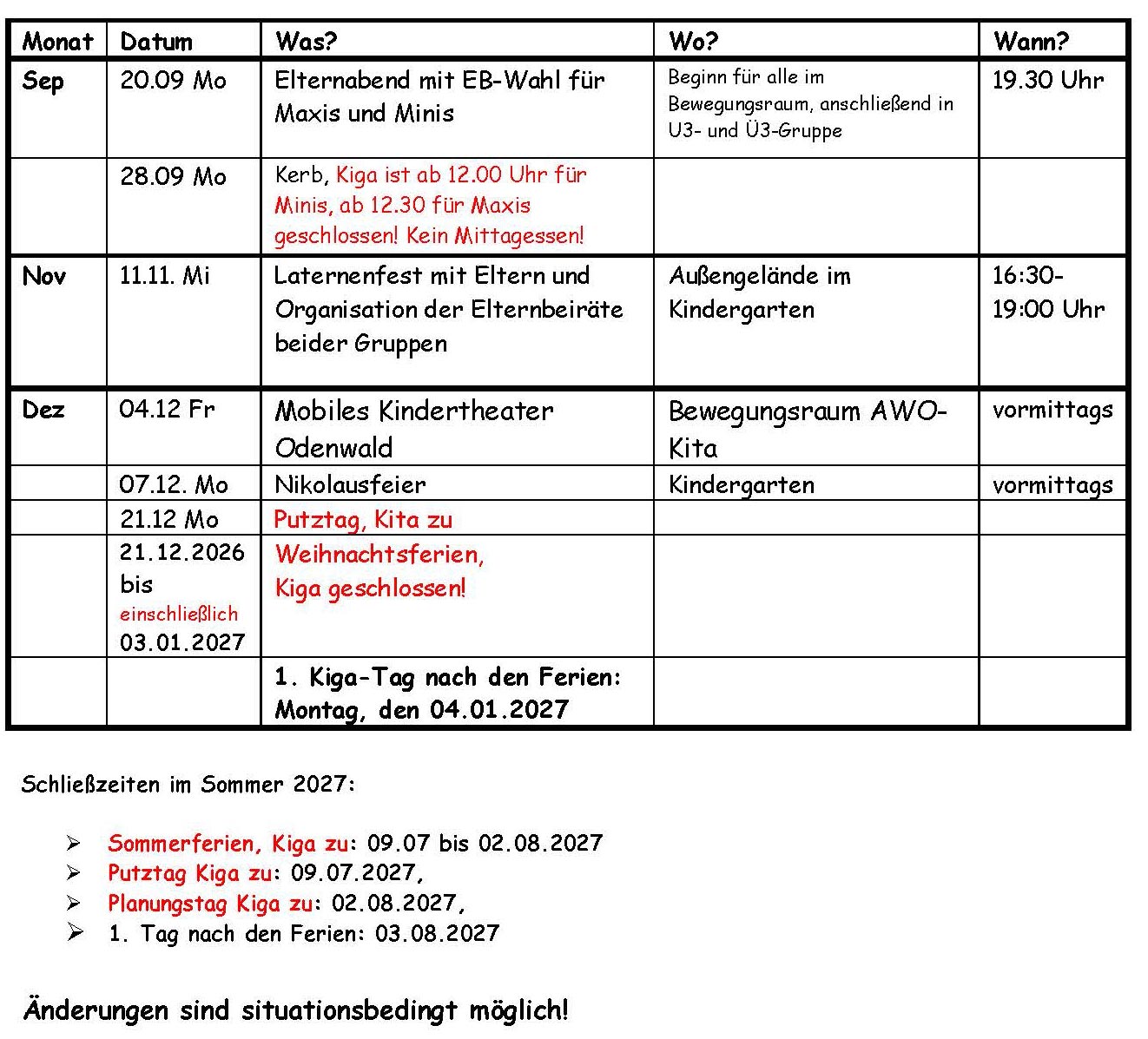 nachstehend möchten wir Ihnen die bis jetzt feststehenden Veranstaltungstermine und Ferien- bzw. Schließungszeiten bekannt geben. Sie haben damit die Möglichkeit, sich frühzeitig darauf einzustellen und eine Überschneidung mit anderen Terminen möglichst zu vermeiden. Für einige Veranstaltungen gibt es vorher einen Infobrief oder einen Aushang.